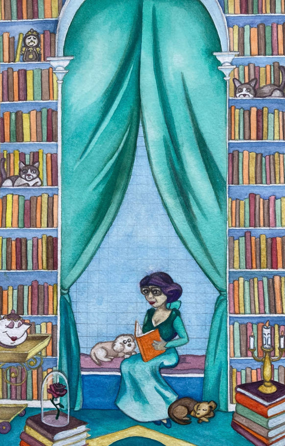 Commissioned portrait for a friend as Belle in the library with her pets. Acrylic on paper.